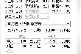 麻雀 天鳳東風戦 2025年11月 反省記 2025年11月の100東風.ここまで通算天鳳3900戦.特上もなんとか落ち着いてきたかもな原点付近の四段810Pt,R1884. 2025.11.30 麻雀