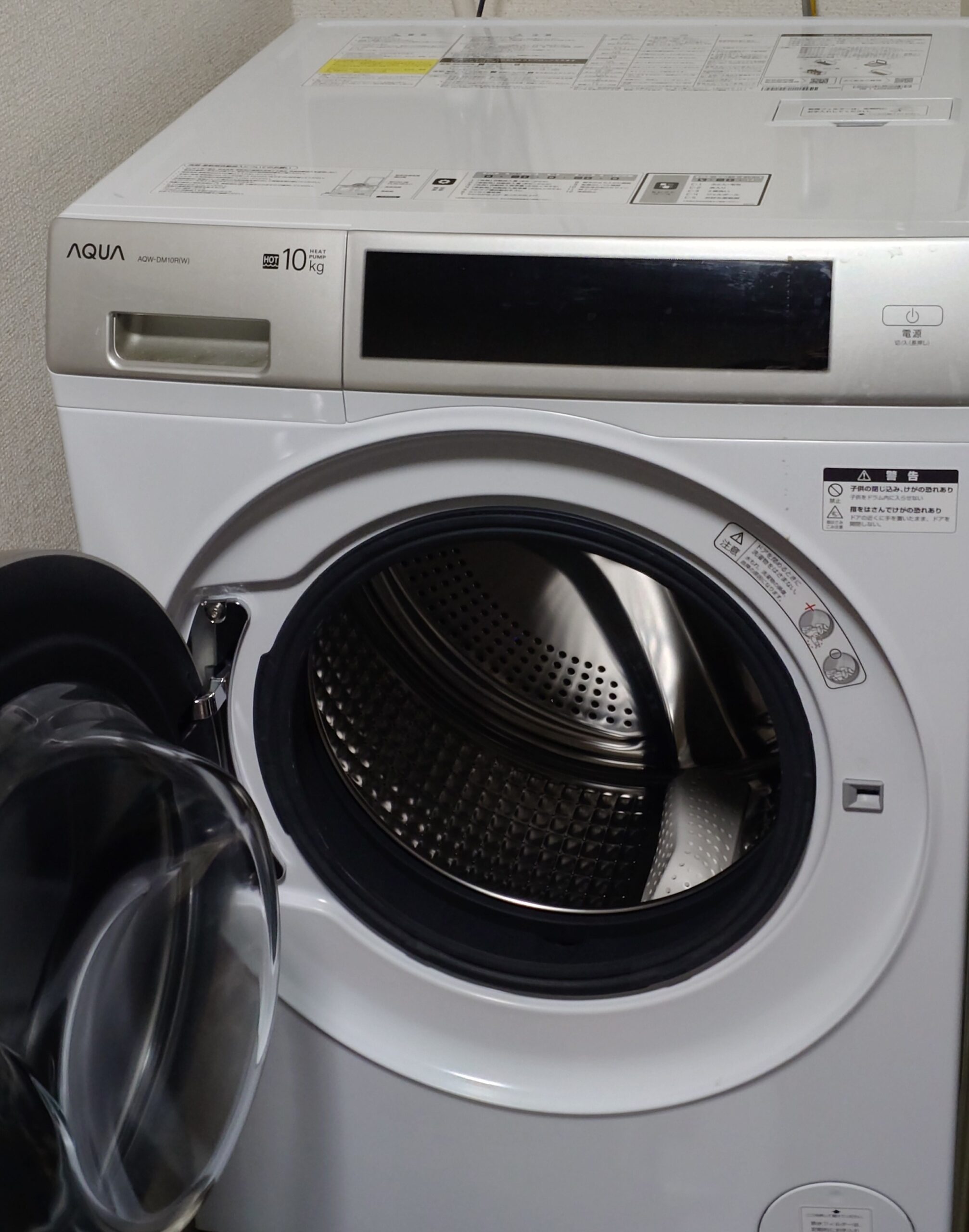 なので,乾燥の消費電力が低く,サイズも小さめという機種で,ほぼ自動的に決まったのがAQUAの10Kgの機種です.乾燥の消費電力はたしか600W程度だったはずです.HITACHIやPanasonicはサイズや消費電力,(あと価格)の面で見送りに・・・