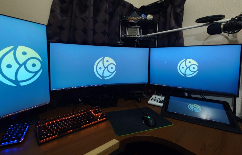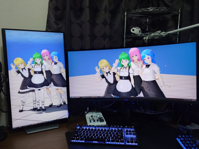 4Kを縦にすることで,縦型ディスプレイのタスクバーが短すぎて入りきらないという問題は横が2160になることで解決します.また,リファレンスモニターとしてみても,2160*1280の縦3段構成もできるし,フルHDでは難しかった縦分割でも横1080確保できるので6画面構成でも可視性に影響が出ないので,横置きよりも機能性を高めることができました.