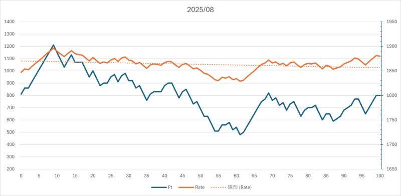 2025年08月の100東風.ここまで通算天鳳3600戦.