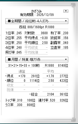 トップラスだけど特上維持のまま100戦できて原点キープの四段800Pt,R1880.