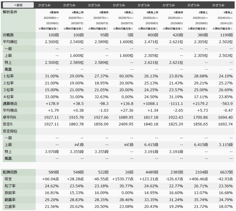 左から今月の合算,先月の合算,特上卓,上卓,今年,昨年.