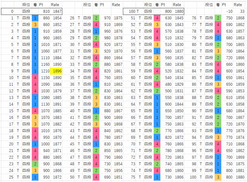 全体の着順はバランスよさげだが,戦績的にはジェットコースターで最初10戦8トップで最高R更新のポイント1210からラスゾーンに入って480まで溶かし,また取り戻して原点へという激しい流れ.