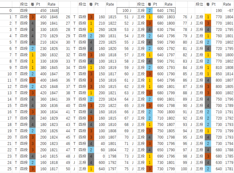 降段直前の100戦の成績.不運もあるし実力もあるけど,それで悪い思いをしたことでさらに悪い選択になる悪循環になってしまった.厳しい.