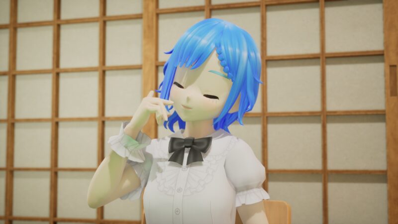 投稿作品ではところどころうまくいっていないところもありますが,ツモの前にキャラクターの姿を入れるようにしたり,瞬きや体を揺らすような細かいモーションを入れて画面ができるだけ止まって見えないように工夫を加えています.